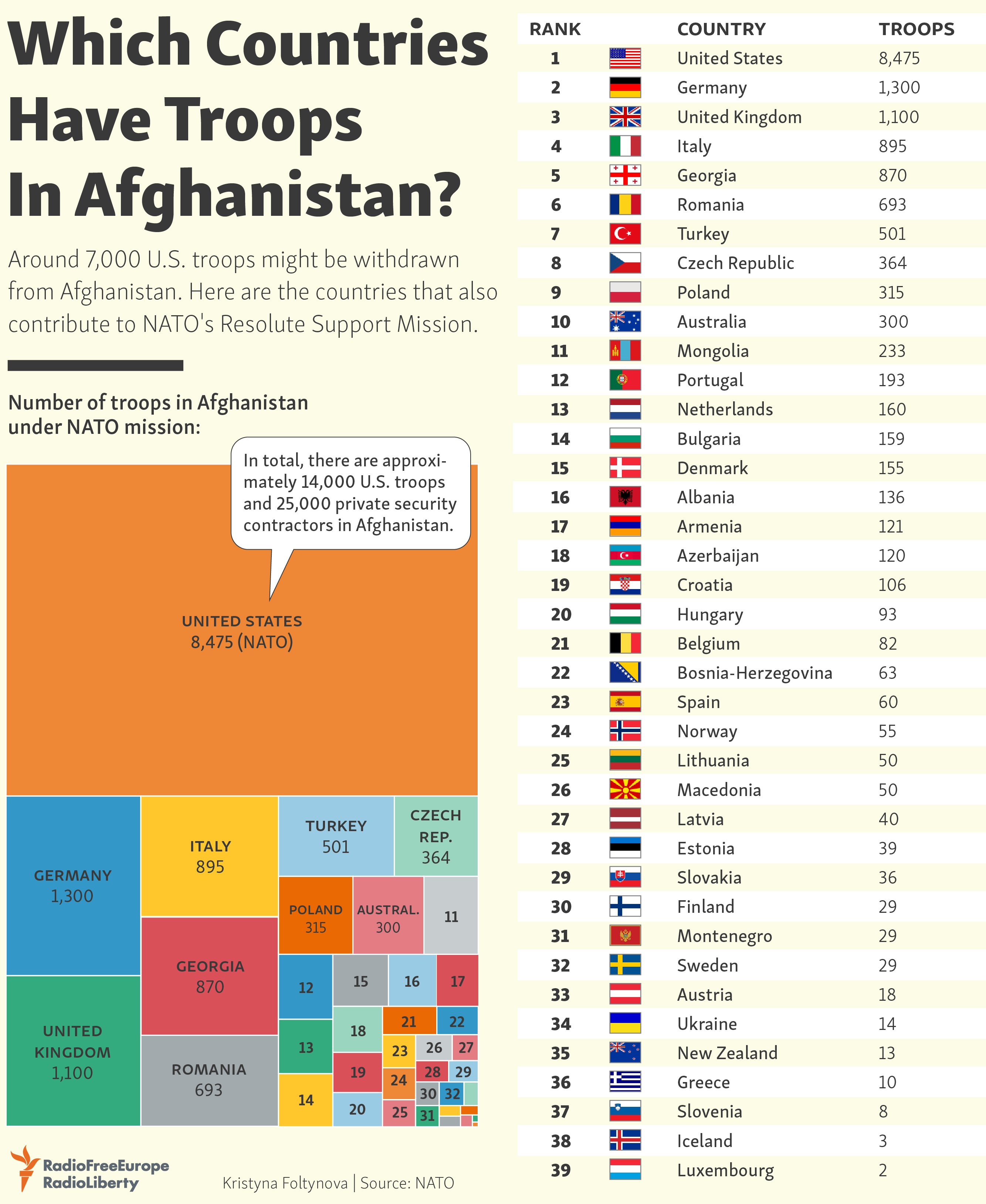 شااوخوا ۷۰۰۰ امریکايي سرتېري به له افغانستان څخه وایستل شي. دلته د هغو هېوادونو لېست هم شته چې د ناټو د قاطع ملاتړ له مأموریت سره همکاري لري.